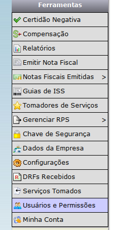 1) Acesse o Menu "Usuários e Permissões". Esta ferramenta lhe dará acesso à gerência de usuários, suas definições e permissões.